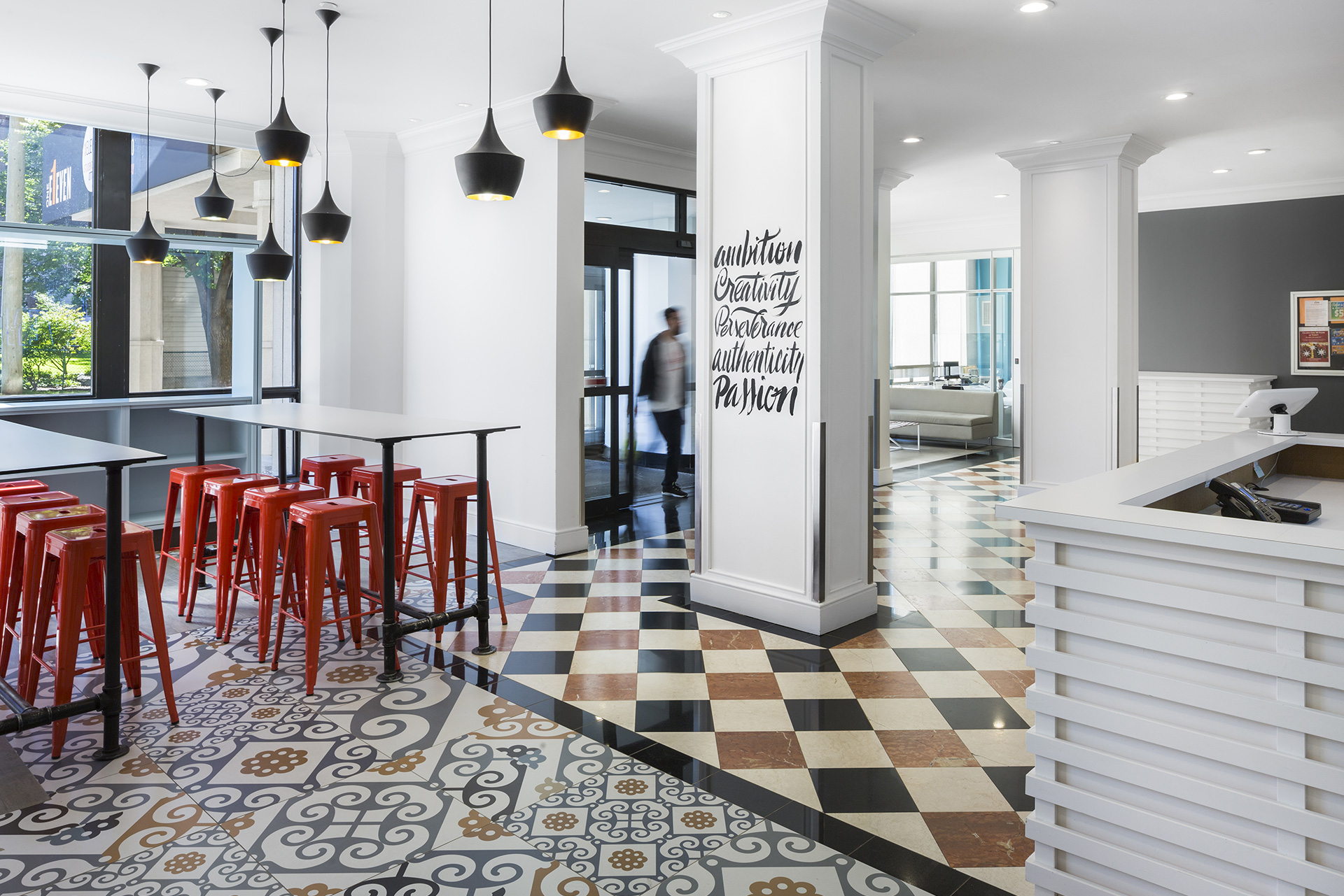 1Eleven est une résidence étudiante à Ottawa, issue de la conversion d’un ancien Holiday Inn. Le projet propose 420 suites entièrement meublées au design original et stylisé, combinant confort et intimité. Il intègre également des espaces communs favorisant la vie étudiante et la socialisation, tels qu’un salon d’étude, un gymnase, un studio de yoga, un salon ludique et un restaurant, avec des aménagements ouverts et connectés pour une circulation fluide et une transparence visuelle remarquable.