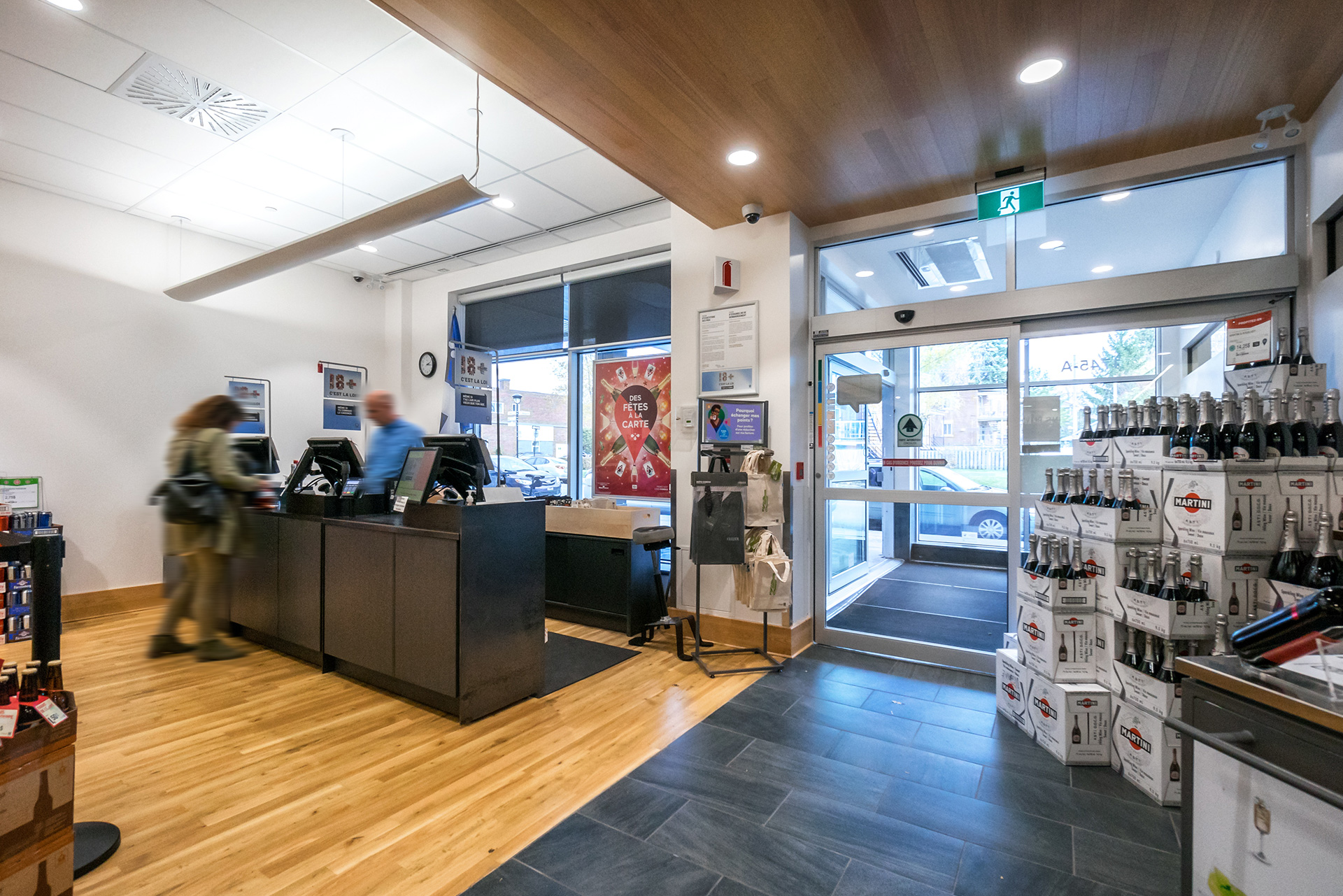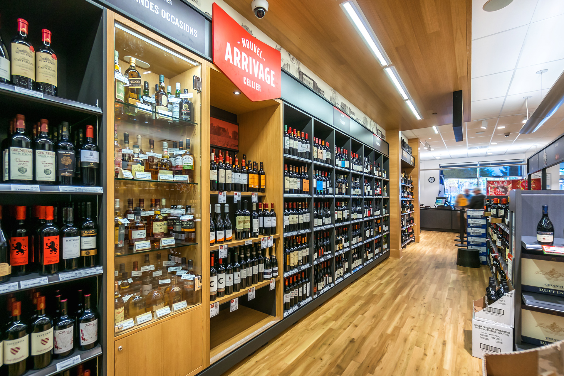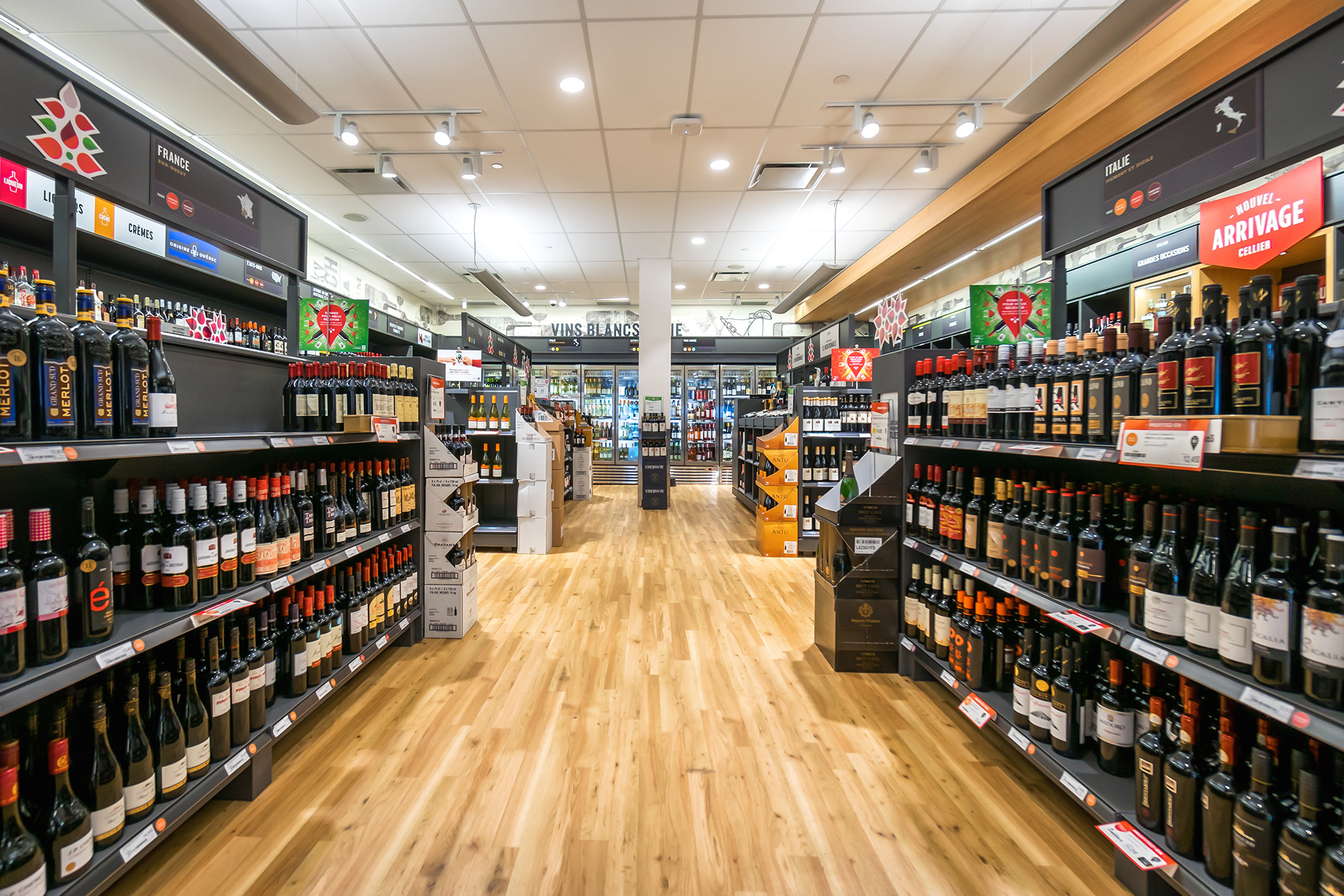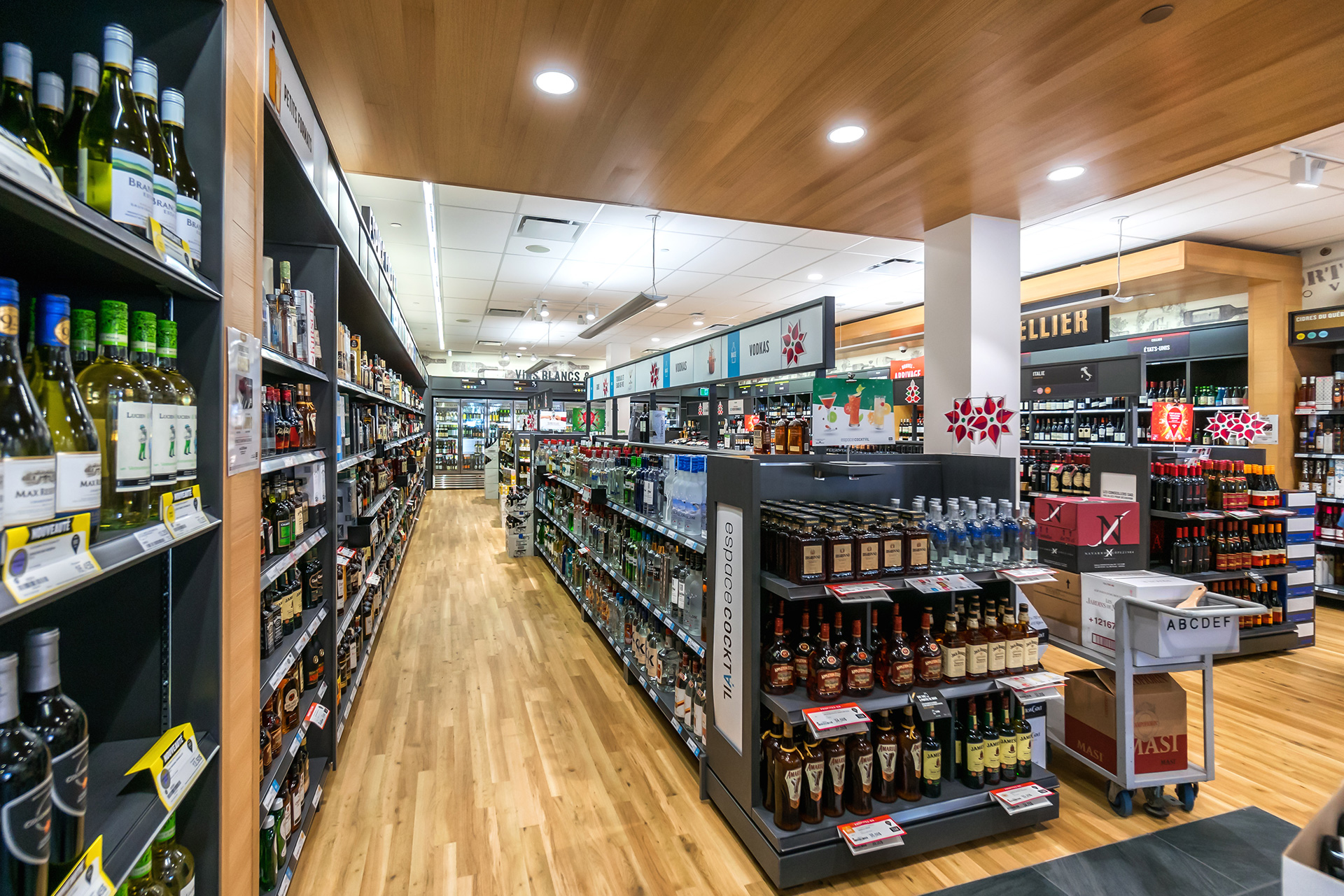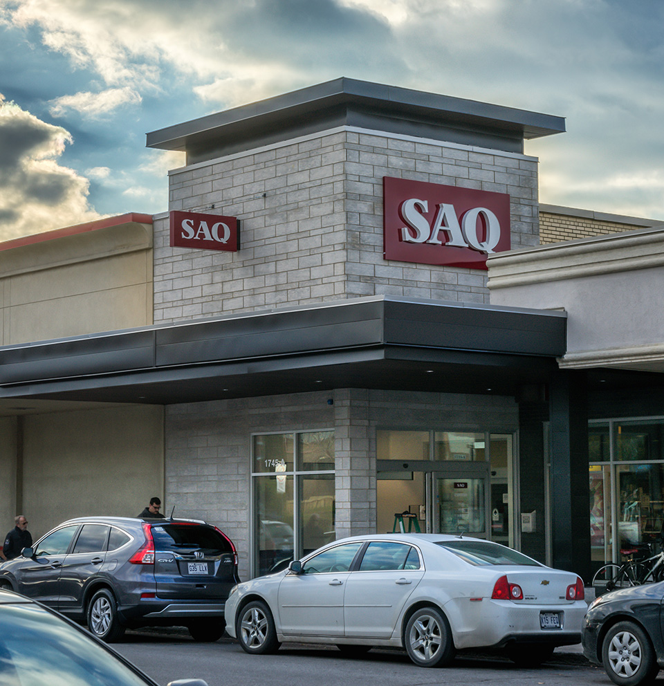 Réalisation de plusieurs succursales de la Société des alcools du Québec dans la région de Montréal et de la Rive-Nord. Il convient de souligner que la succursale du centre commercial Côte-Vertu, certifiée LEED Argent, a été livrée clé en main.